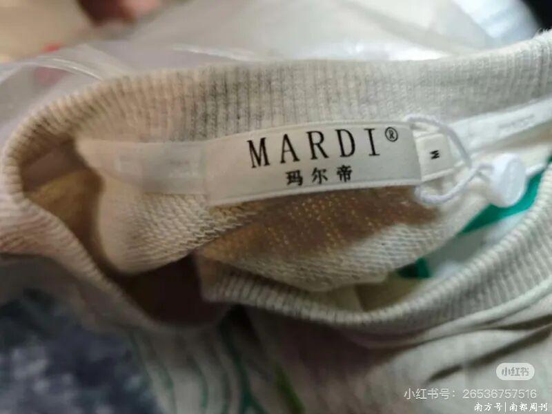 小雏菊和腊肠犬,是Mardi Mercredi最具辨识度的设计符号,成为品牌的象征。T恤价格从200元起,毛衣、衬衫等也在500元至千元之间。这种亲民的价格策略吸引了许多年轻女性消费者。然而南都N视频记者发现,在天猫还有一个名叫MARDI(中文名:玛尔蒂)的旗舰店,其服饰的主要设计元素也是小雏菊和腊肠犬,价格区间与Mardi Mercredi相近,产品标签上标注“MARDI 玛尔蒂”字样。小红书上许多网友表示“两个分不清”“曾经买错了”“关的是哪一个?”“这是不是擦边卖假货?”