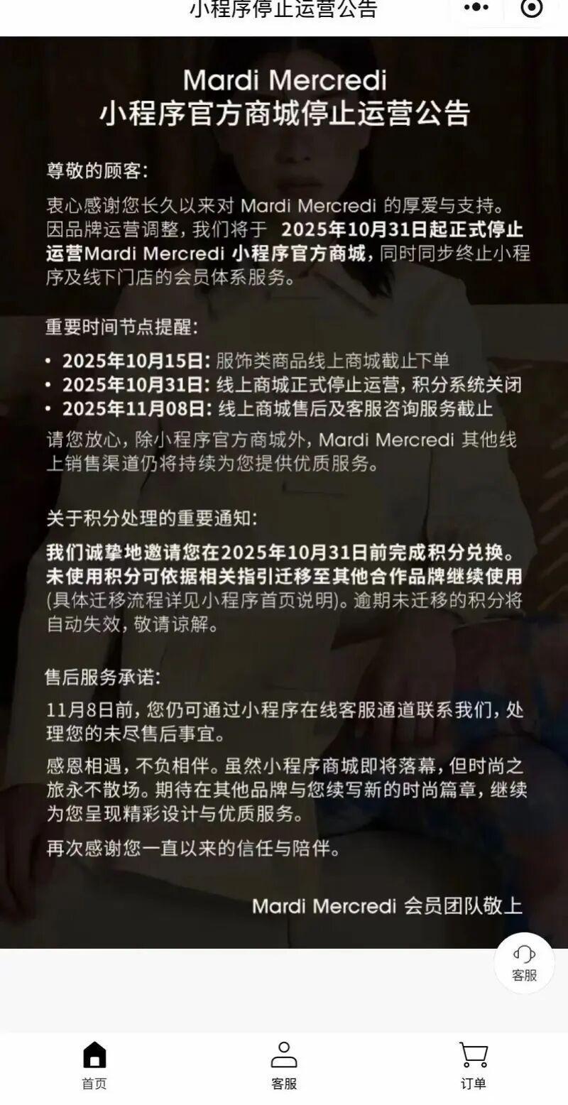 该品牌小程序商城官方公告显示:10月15日起停止服饰类商品下单;10月31日起小程序商城及会员体系关闭,积分系统失效,会员需在规定时间前完成积分及等级向Raive与Rest&Recreation两个新品牌的迁移;11月8日起售后与客服服务截止。品牌天猫旗舰店、抖音旗舰店及小红书商城等电商平台仍在正常运营。