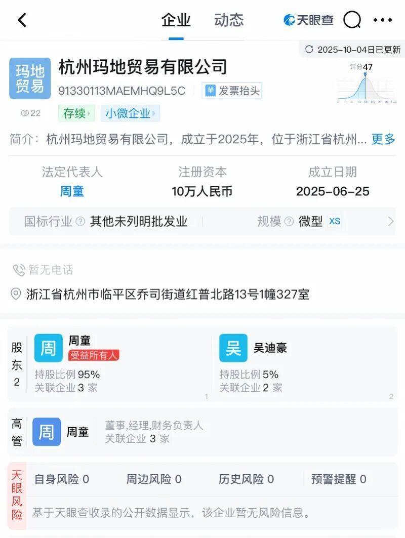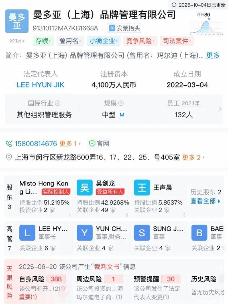 记者查阅两个品牌的天猫网店经营者证照,Mardi Mercredi品牌的企业名称为曼多亚(上海)品牌管理有限公司(以下简称:曼多亚),曾用名为玛尔迪(上海)品牌管理有限公司,成立于2022年,位于上海,是一家以从事商务服务业为主的企业,注册资本4100万元。而MARDI品牌的企业名称为杭州玛地贸易有限公司,成立于2025年,位于杭州,是一家从事批发业为主的企业,注册资本10万元。曼多亚公司曾于2024年底发布声明,强调其为中国大陆地区唯一合法运营商。