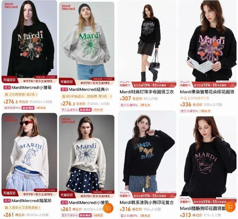 Mardi Mercredi品牌天猫旗舰店目前有粉丝83.5万,是淘宝街潮女装品牌店铺榜的榜三,店铺年销量50万+件。MARDI品牌天猫旗舰店目前有粉丝近10万,店铺年销量7万+件。据MARDI品牌官网介绍,其品牌主理人Léa Bergon(Baudino Cd L)创作“MARDI”的灵感来源于1975年法国电影 《表兄妹》中的女主角“玛尔蒂MARDI”的精彩表演。官网同时表示,其线下门店已开了100余家,并特别声明“我司所使用的‘雏菊、狗、橘子’为社会公共资源图案,各个品牌及服装企业均在使用,与Mardi Mercredi没有关联”。