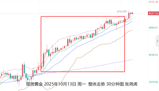 10月14日:上交易日周一(10月13日):国际黄金强势拉升,再度刷新历史高点,如期触及给出的扩展线目标位4110美元,并持稳收阳,多头动力持稳股票配资流程,暗示后市将继续走强,等待触及7月份给出的看涨目标4200美元目标。
